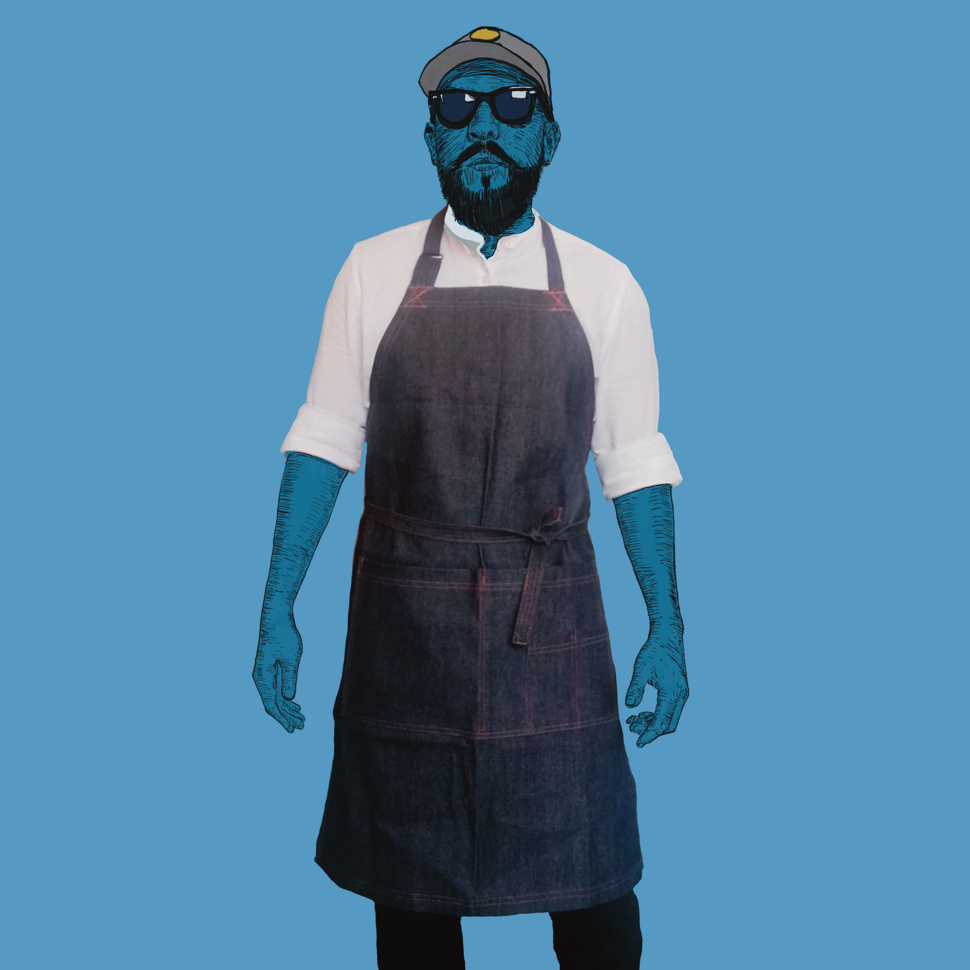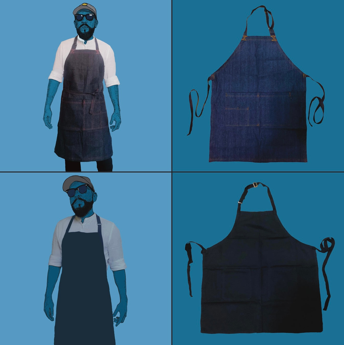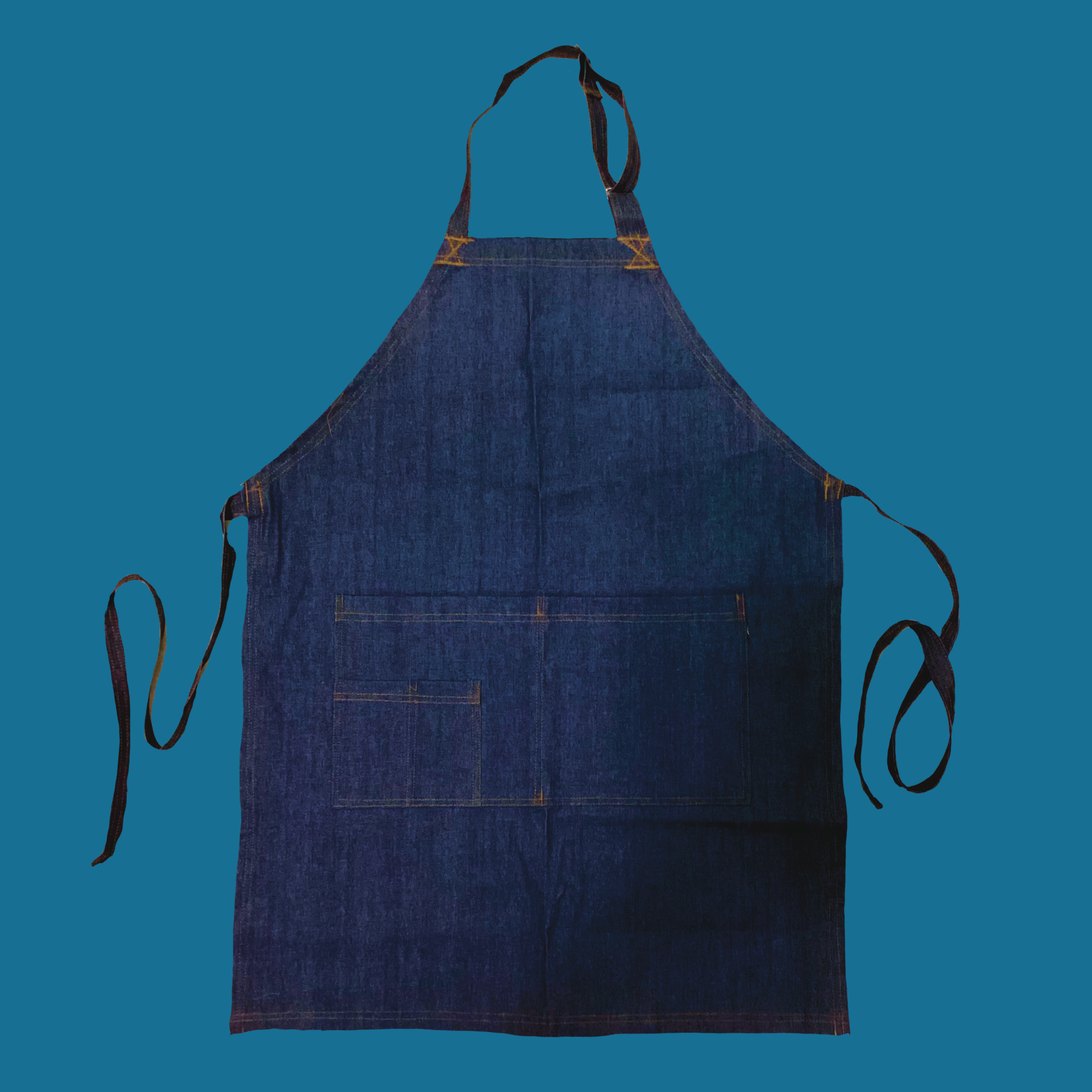 Mandil de Mezclilla ajustable al cuello y cintura de 70 cms de largo.