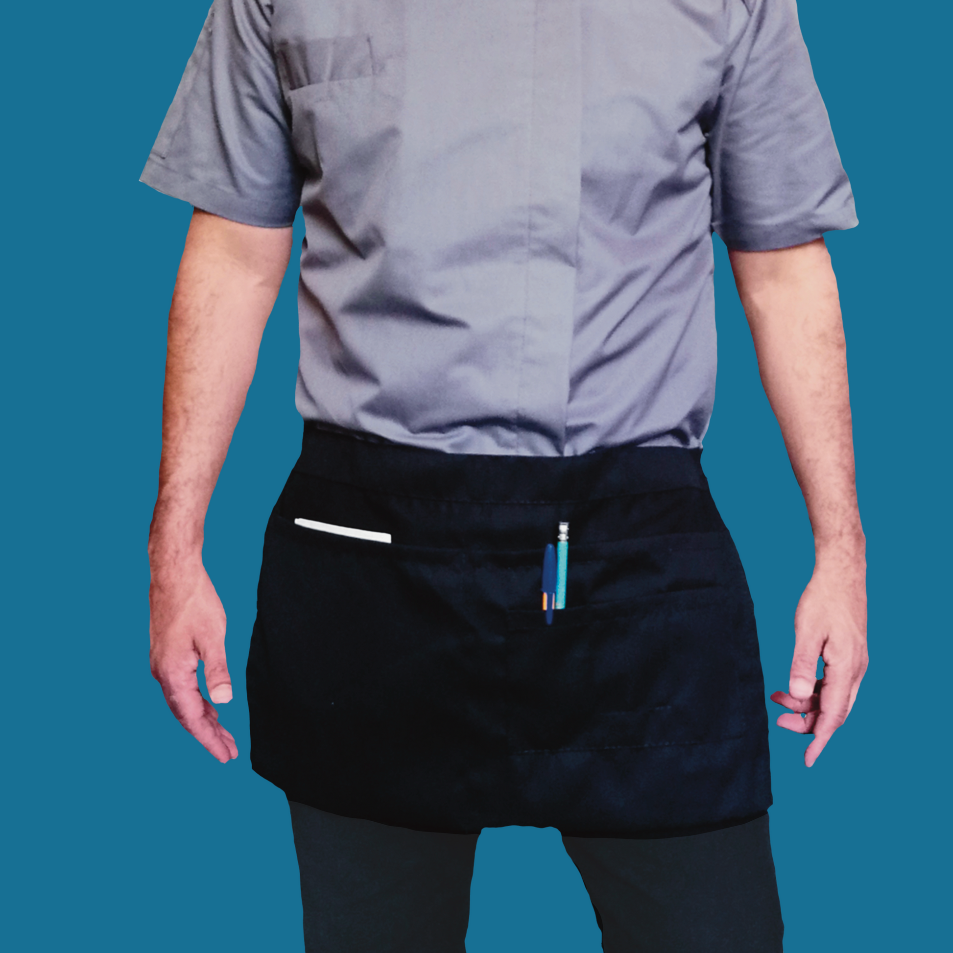 Medio mandil corto. Ideal para Bar, Restaurante o cafetería. En tela gabardina algodón poliéster color negro Unitalla Ajustable.